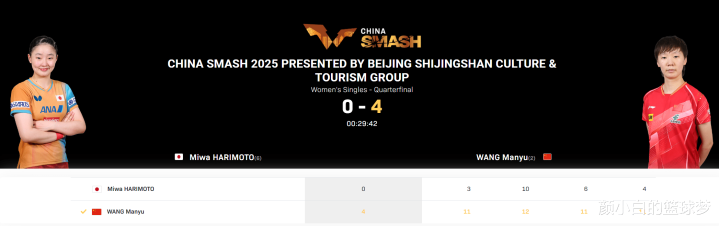 王曼昱3-0早田希娜【11-6,11-4,11-5】,早田止步16强;